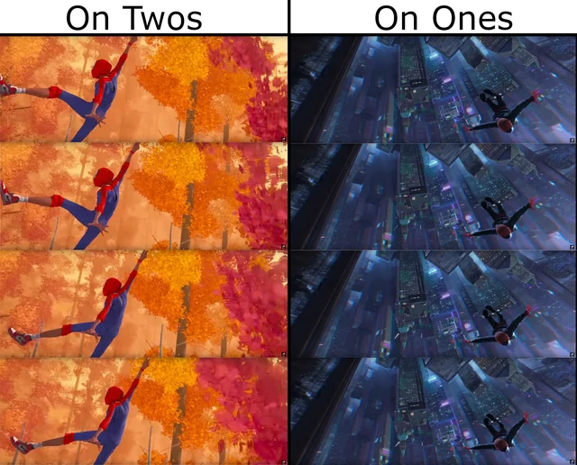The reason this works is because 24 frames per second (FPS) is the minimum amount of frames needed to fool the human eye into seeing continuous unbroken movement. This means that when Miles is animated on 12 FPS at the start of the film his movements are very obviously “Crunchy” according to a producer for the film. This was done intentually to show his inexperience and lack of skills in comparison to the other “Spider-Men”. You might think something as subtle as this would go unnoticed. However, because of this technique, the growth and development of his skills is noticed subconciously towards the end of the movie.
