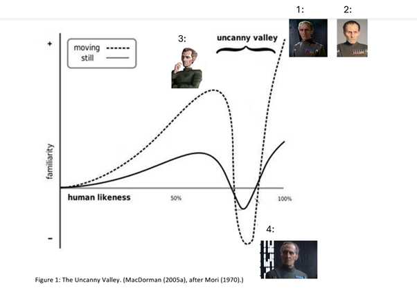 Image 1 is the actor, Peter Cushing, who walks, talks, moves and breathes like a real human, with micro-expressions on his face and depth behind his eyes, so we don’t experience the UVP. This is the earliest iteration of Tarkin, many years before CGI was good enough to be able to render a human.